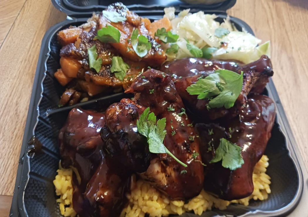 - Shrimp & Salmon bowl (yellow rice or quinoa, spinach, onions & peppers, fresh salmon chunks & shrimp drizzled w/ garlic butter) Reg or Jerk